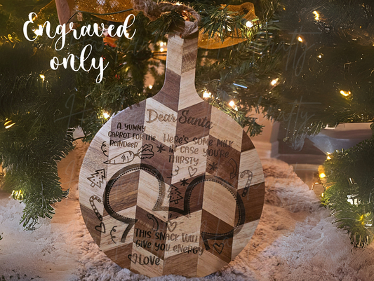 Laser engraved personalized Santa cutting board made of food safe premium acacia wood.