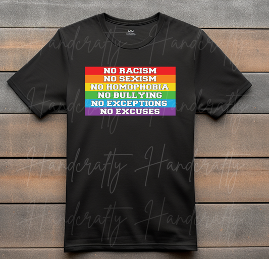 No racism, no sexism, no homophobia, no bullying, no exceptions, no excuses, pride T-shirt