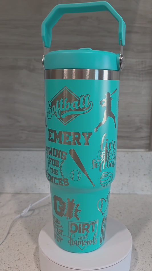 Personalized laser engraved softball flip straw insulated tumbler, softball coach insulated stainless steel tumbler cup, softball team tumbler