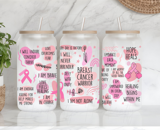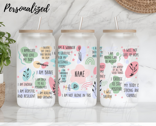 Personalized Breast cancer warrior daily affirmations insulated stainless steel tumbler, mug or Libbey glass cancer survivor gift.