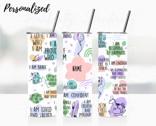 Personalized Kid daily affirmations stainless steel insulated tumbler, shimmering and flip straw bottle.