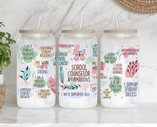 Personalized school counselor daily affirmations insulated stainless steel tumbler, mug or Libbey glass can