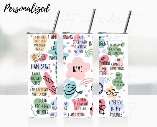 Personalized Student daily affirmations stainless steel insulated tumbler, shimmering and flip straw bottle.