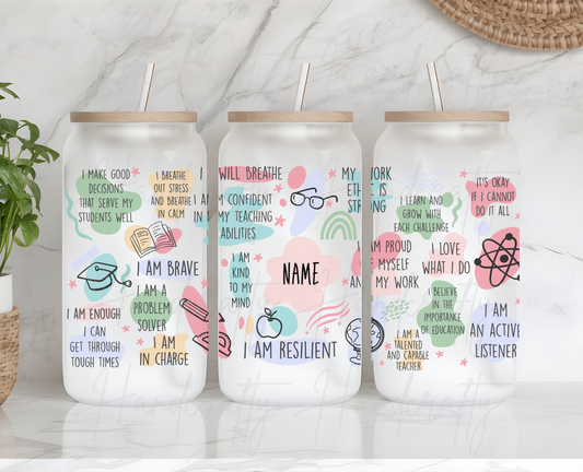 Personalized teacher affirmations insulated stainless steel tumbler, mug or Libbey glass can