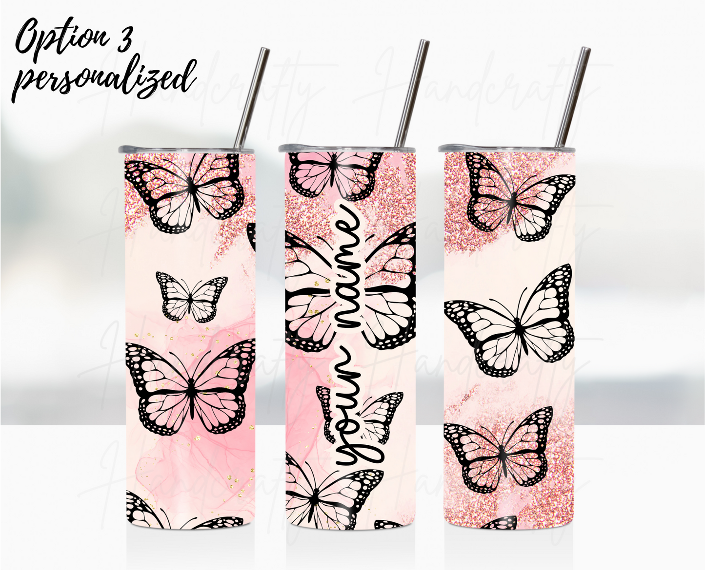 You can choose the print to come on a regular tumbler or a glittery/shimmering one for a sparkling effect.