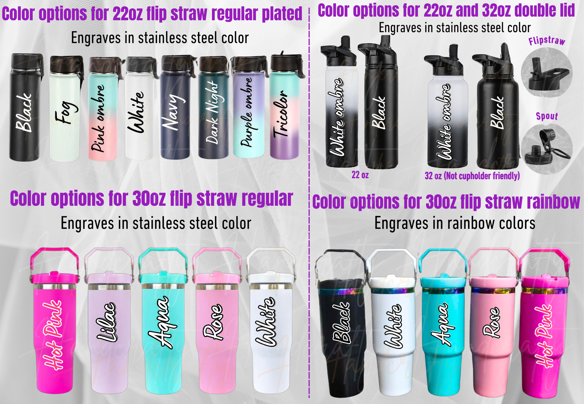 🤸♀️Spill resistant: our quencher style 30 to 40 oz have a rainbow coated effect when engraved and it has a spill prevention lid but is not leak proof.