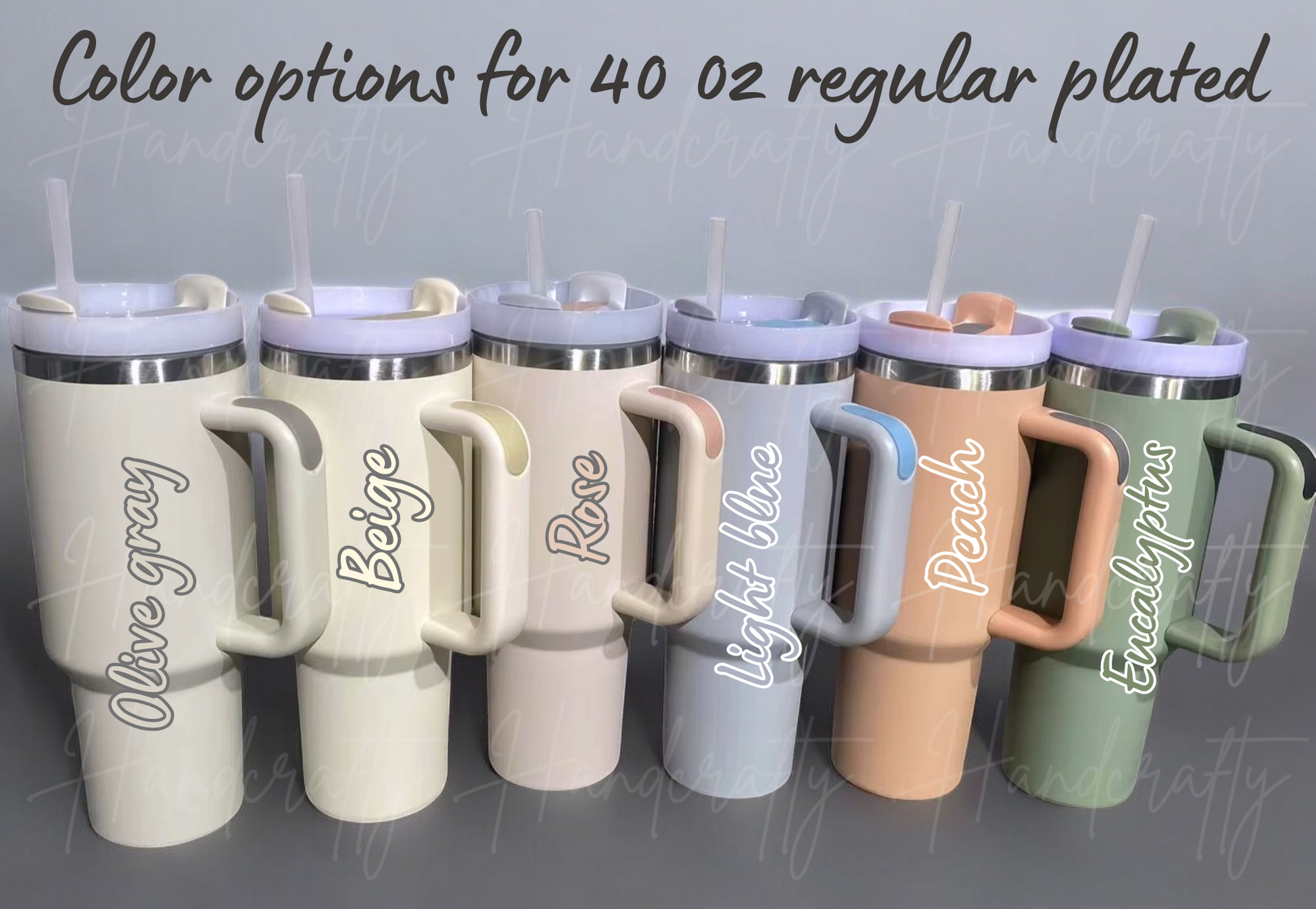 - 40 oz Rainbow (Aqua, Hot pink, Pink, Black and White) Includes metallic straw. Regular plated (Olive gray, Beige, Rose, Peach, Light blue, Eucalyptus) includes plastic straw.