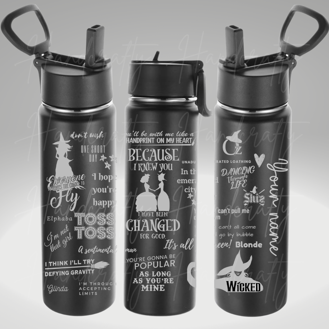 Wicked inspired double wall insulated powder coated stainless steel laser engraved flip straw water bottle cup.